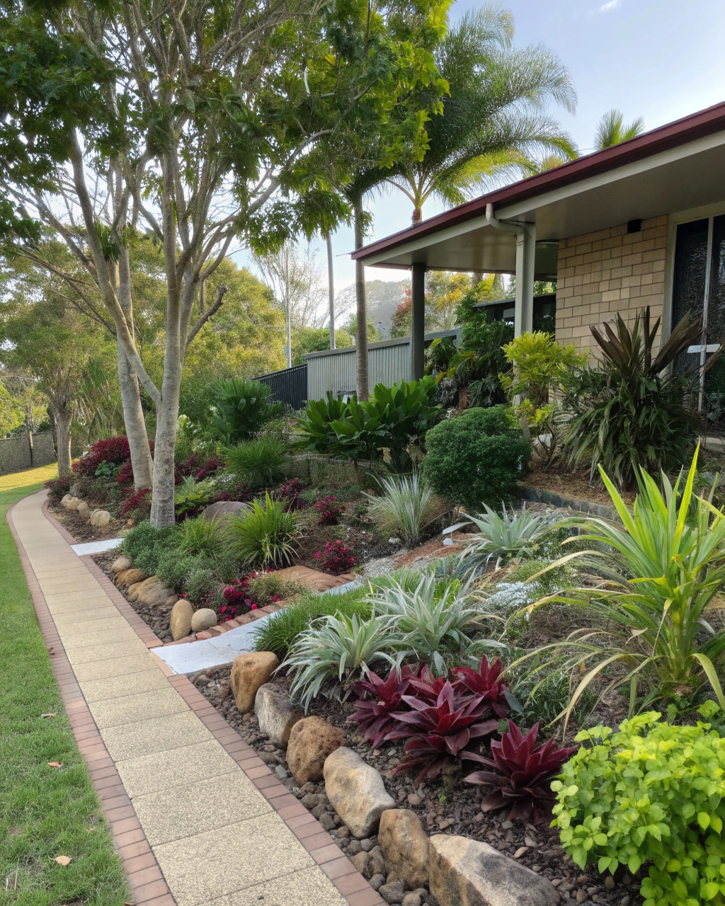Tropical coastal resort approaches work in protected areas where we bring in palms and lush foliage around pool-centred entertaining spaces, giving you that holiday feel at home with resort-style furniture placement and deck areas. Native coastal bush designs use indigenous Queensland species in natural arrangements that attract birds and butterflies while needing minimal maintenance once established.