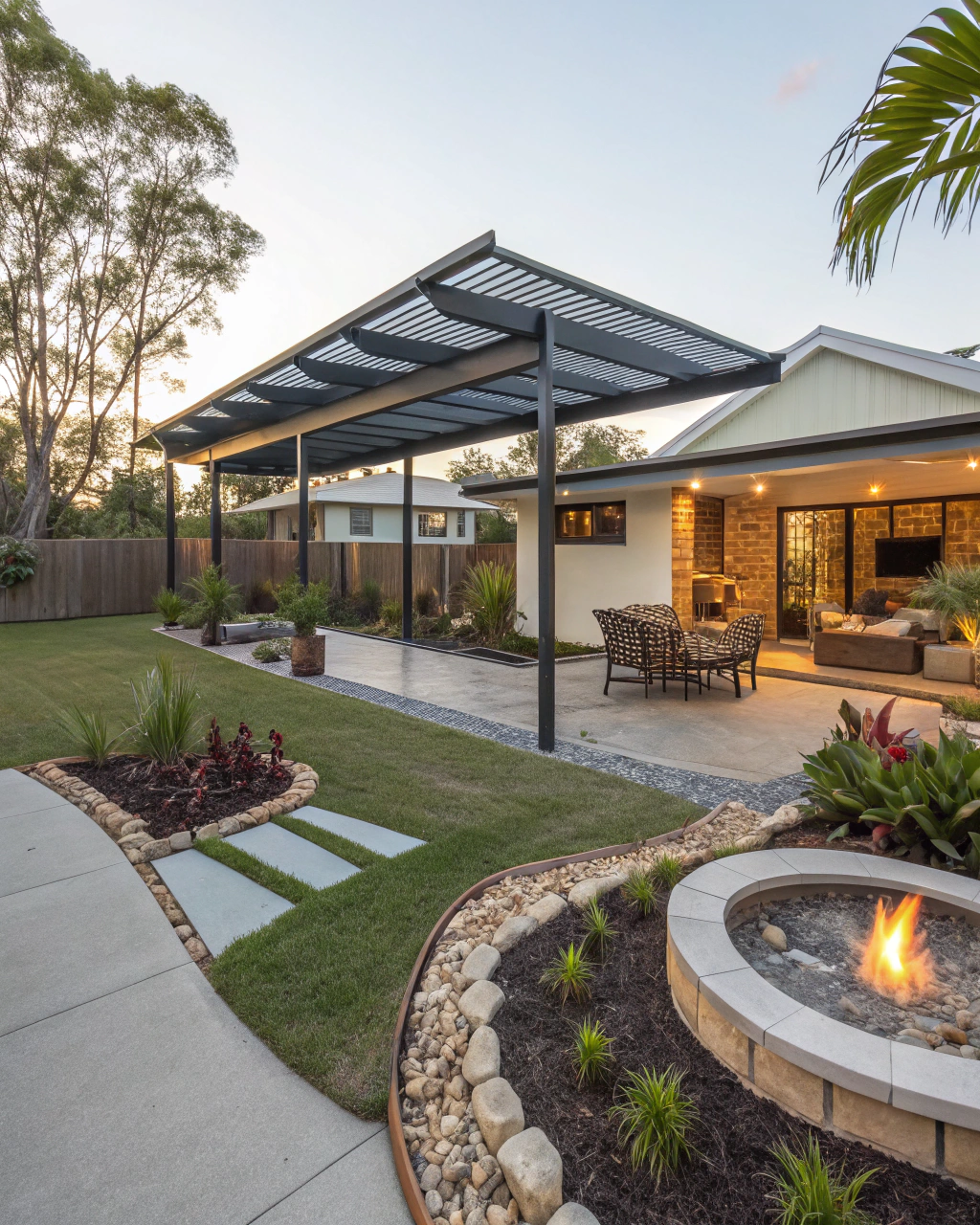 Rustic Australian Approach: Sandstone or concrete pavers in informal layouts. Bush garden integration with native plants. Fire pit becomes focal point for cooler months. Suits larger semi-rural properties in Gracemere and Parkhurst where you’ve got more space.